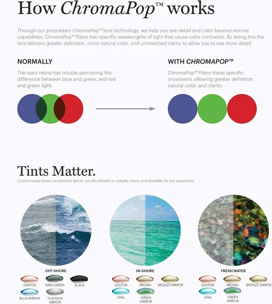 - ChromaPop lenses filter specific wavelengths of light that cause color confusion, delivering natural color and excellent definition, detail and clarity