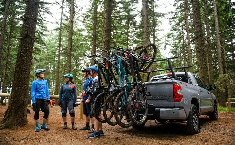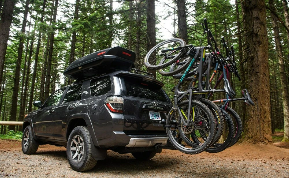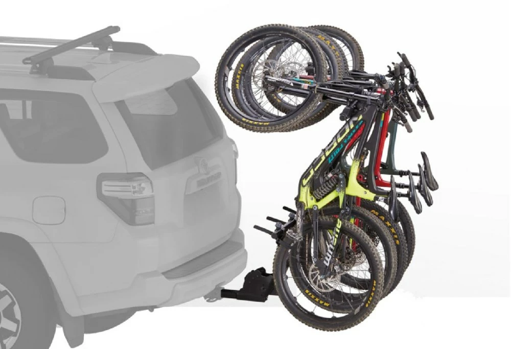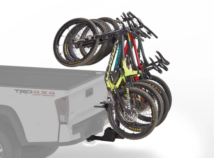The Yakima HangOver 4-bike hitch rack securely hauls up to 4 mountain bikes to the trailhead in a space-saving vertical orientation. It’s capacity makes it ideal for group rides and families.